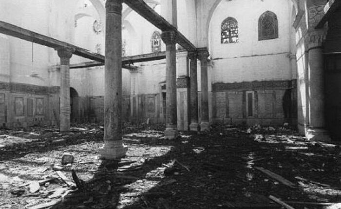 كما نالت كل محتوياته من المصاحف والأثاث، وتضرر البناء بشكل كبير، مما تطلب سنوات لترميمه وإعادة زخارفه كما كانت.