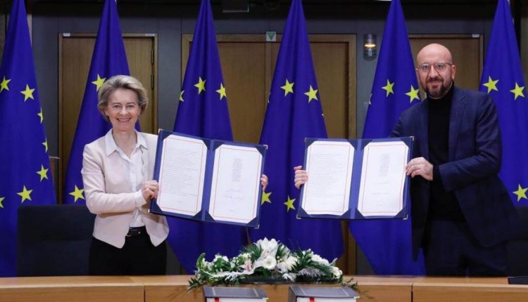 ووقعت كلا من رئيسة المفوضية الأوروبية أورسولا فون دير لايين، ورئيس المجلس الأوروبي شارل ميشيل على الاتفاق .
