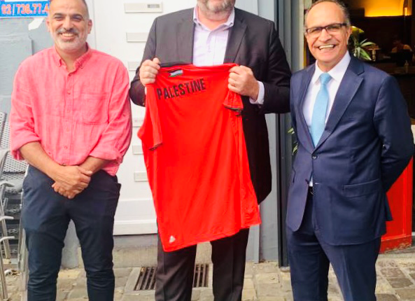 بروكسل – يورو عربي| منحت الجالية الفلسطينية في بلجيكا مدير شعبة الشرق الأوسط وعملية السلام بجهاز الخدمة الخارجية للاتحاد الأوروبي نيال ماك كال قميص الفريق الوطني والكوفية الفلسطينية.